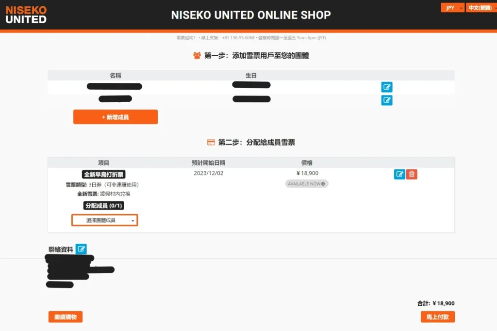 若你買不只一張,需要新稱其他成員,一樣填入基本資料,接著在雪票項目下方選擇要分配給哪一位成員